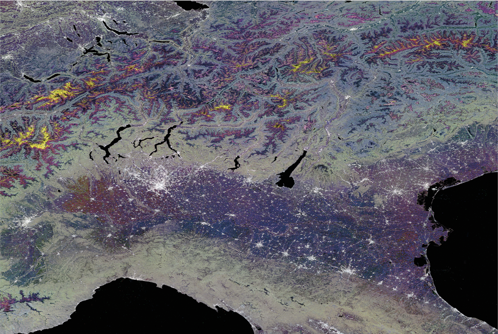 This year’s UZH festive card features an image drawn from UZH research with a link to space-based observation. The selected image was contributed by the Department of Geography and is based on satellite data, showing dry snow on mountain peaks in yellow, while areas of consistently strong backscatter in urban regions appear in white.